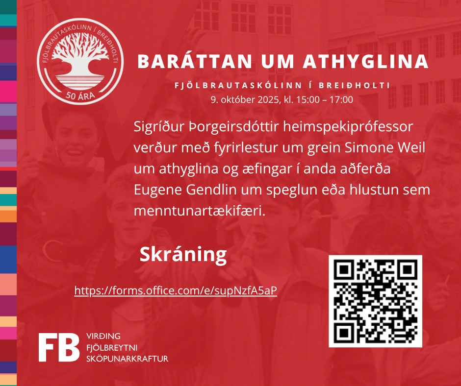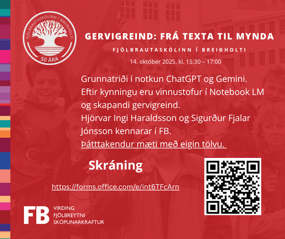 Sigríður Þorgeirsdóttir heimspekiprófessor reið á vaðið þann 9. október og næst á dagskrá þann 14. október er Gervigreind: Frá texta til mynda þar sem Hjörvar Ingi Haraldsson og Sigurður Fjalar Jónsson kennarar í FB fjalla um grunnatriði í notkun ChatGPT og Gemini. Eftir kynningu eru vinnustofur í Notebook LM og skapandi gervigreind. Þátttakendur mæti með eigin tölvu.